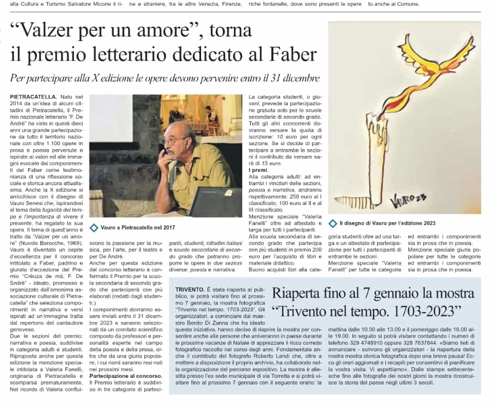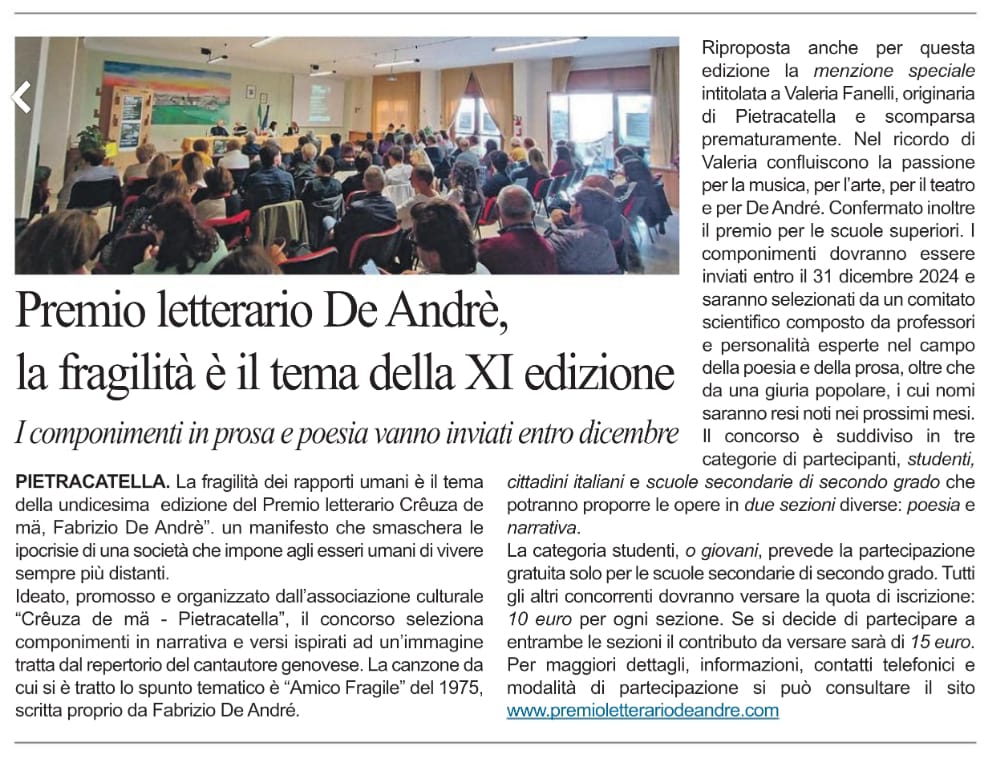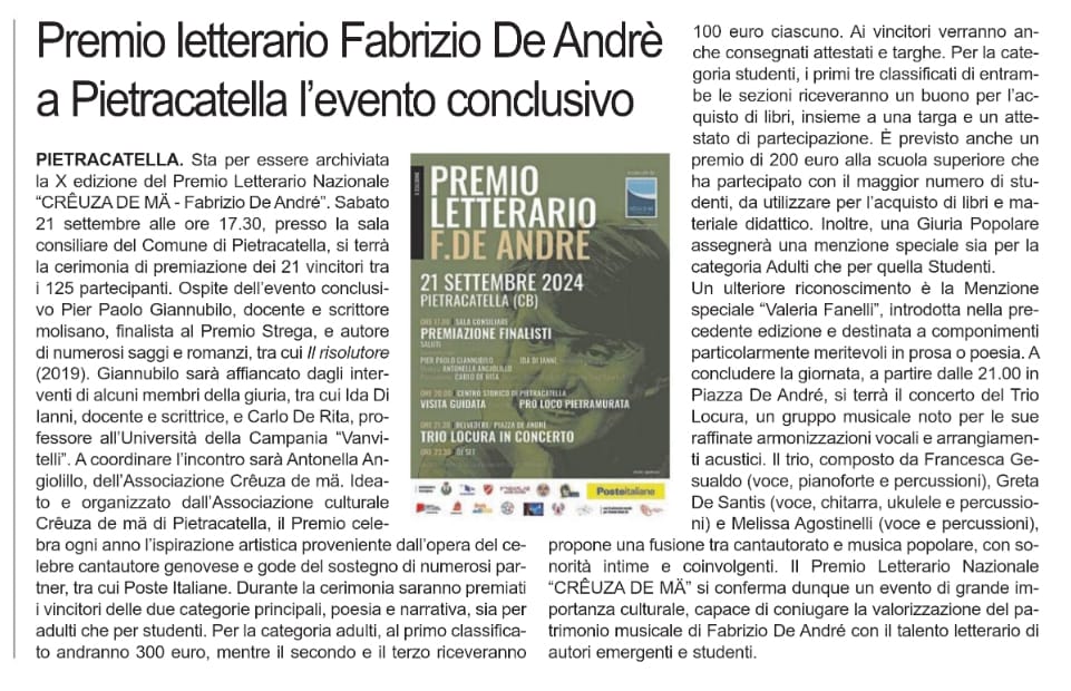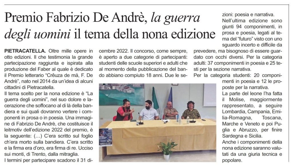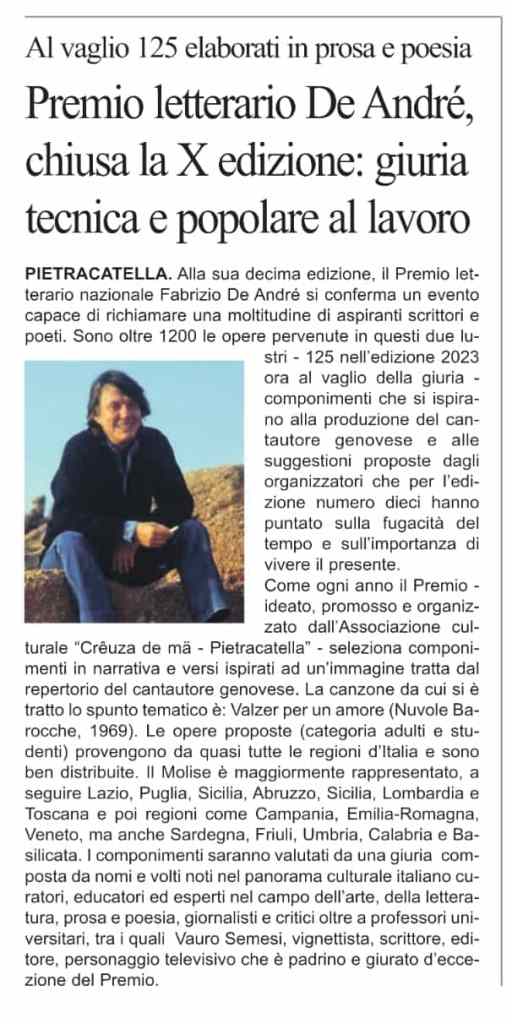 Premio letterario nazionale CRÊUZA DE MÄ, F. DE ANDRÈ a Pietracatella