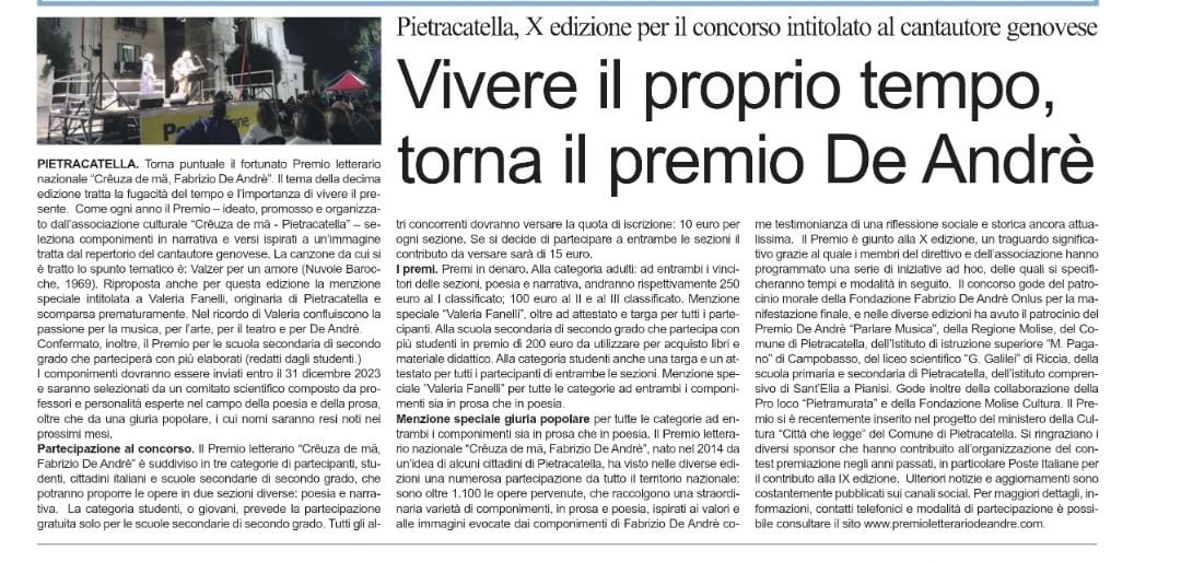 Premio letterario nazionale CRÊUZA DE MÄ, F. DE ANDRÈ a Pietracatella